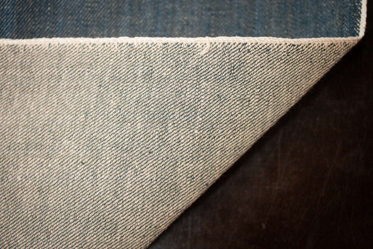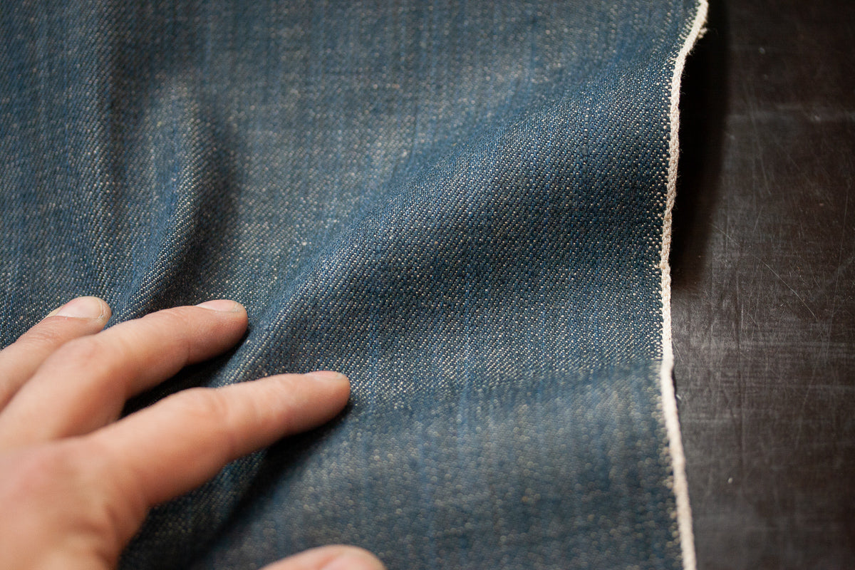 Dieser Naturindigo-Leinen-Selvage Denim aus Japan besitzt ein Gewicht von 13 oz und wird von Nihon Menpu in Ibaragefertigt. Mit einem Anteil von 15 % Leinen kombiniert der Stoff die klassische Indigo-Denim-Optik mit einer besonderen Textur und zeichnet sich durch markante, vertikale Linien aus – eine sogenannte „Waterfall“-Struktur, die dem Gewebe Dynamik und Charakter verleiht.